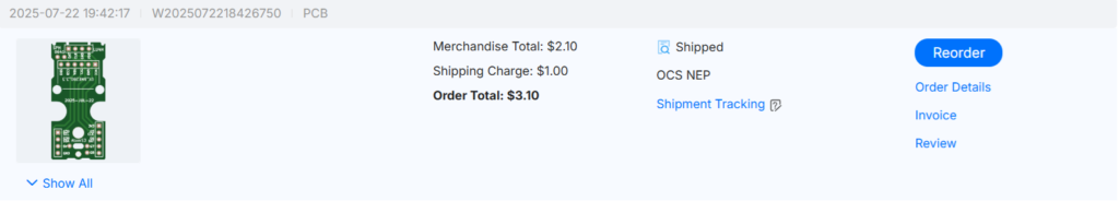 PCBの作成は、その時点では一番安かった JLCPCB を利用した。クレジットカードがあれば注文できるので簡単である。注文した時点では、基板5枚で$2.10(Merchandise total)、送料(Shipping charge)が$1.00 (OCS NEP)で、合計$3.10と安かった。注文してから、10日で手元に到着した。送料をケチっているので時間はかかっているが、ユニバーサル基板に手で配線するのに比べればPCBを作成した方が手間が減ると思う。