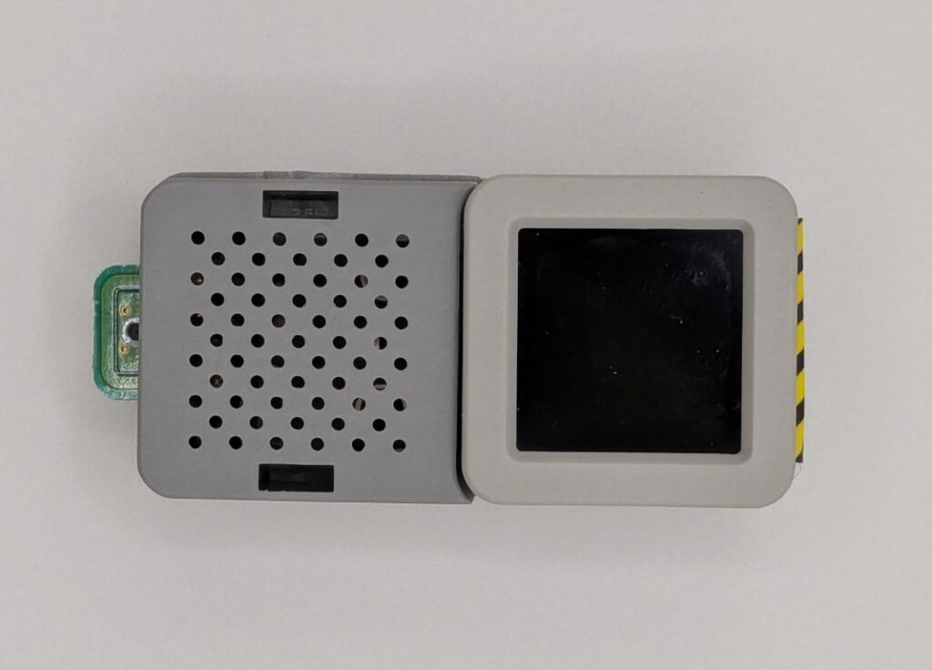 AtomS3 を取り付け、カバーをつけると次のようになる。マイクの音響ポート(集音口)は一応カバーの外側にあり、外部の音を録音できる。